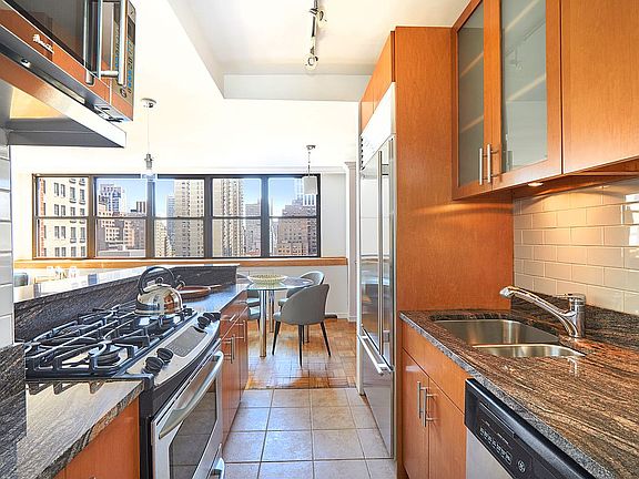 Back on the market after deal fell through – A high-floor two-bedroom, two-bathroom home in move-in condition with a low monthly maintenance of only $2,081. The generous foyer has a coat closet and leads to the spacious living room bathed in sunlight through a wall of windows. There are custom built-ins, crown molding, and recessed lighting throughout. The open kitchen features stainless steel appliances, wood cabinets, glass tile backsplash, and marble countertops. A hallway leads to the large primary bedroom with a renovated en-suite bath. The second bedroom has an equally lovely bathroom accessed off the hallway. This home has higher ceilings than most in the building. Other amenities include through-the-wall air-conditioning, washer/dryer, and custom closets in every room. Currently, there is a low assessment of $100 per month.