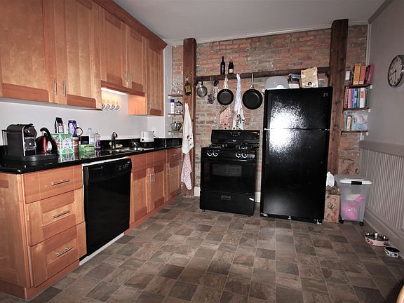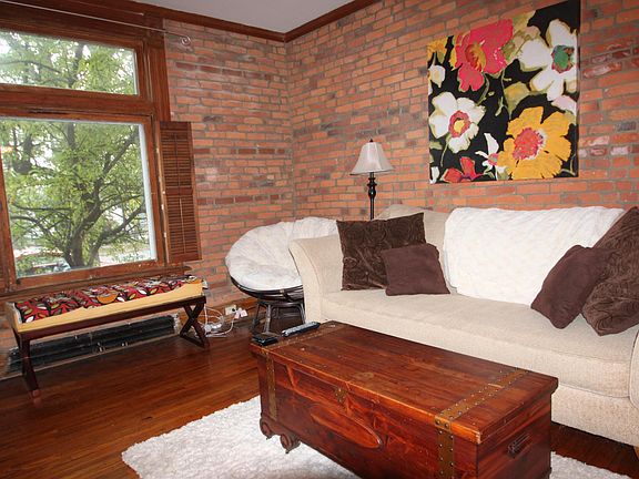 Original hardwood floorsRemodeled kitchenExposed brick walls