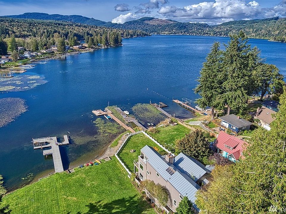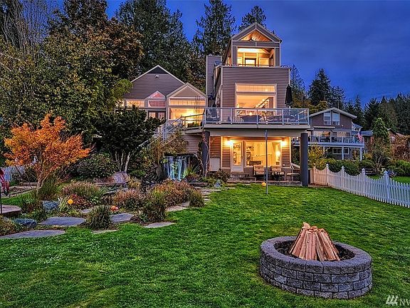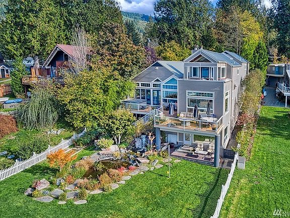 Sweeping views of Lake Samish from this extraordinary architecturally-designed home with a detached guest house. Gated courtyard with a private garden & water feature. Refined luxury blends sleek finishes & comfort. Expansive deck overlooking lawns, waterfall/pond & lakefront. Entertain in the culinary kitchen with a butlers pantry. Soaring ceilings in living room area + sitting area are anchored by a fireplace. Amazing master suite. 72 ft of lakefront with a 60 ft dock. 10 minutes to Fairhaven!