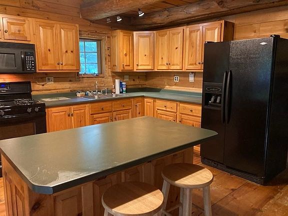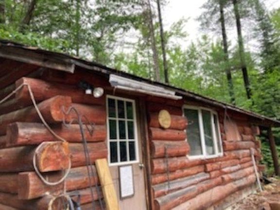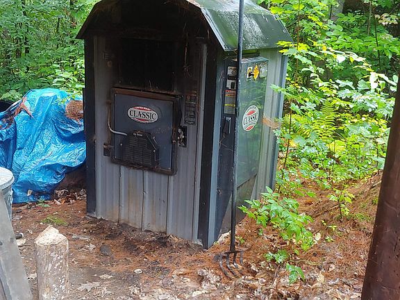 Log home sits back from road on this private 15 acre lot. Partially finished lower level, main level with living room, bedroom, kitchen, full bath plus loft to the second bedroom loft area. The appliances are included and the house is heated by a wood furnace that has a propane back up. The property also includes a rustic workshop with heat and electricity. Lower level rooms are partially finished. Measurements are approximate.