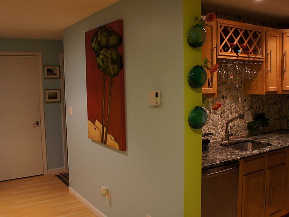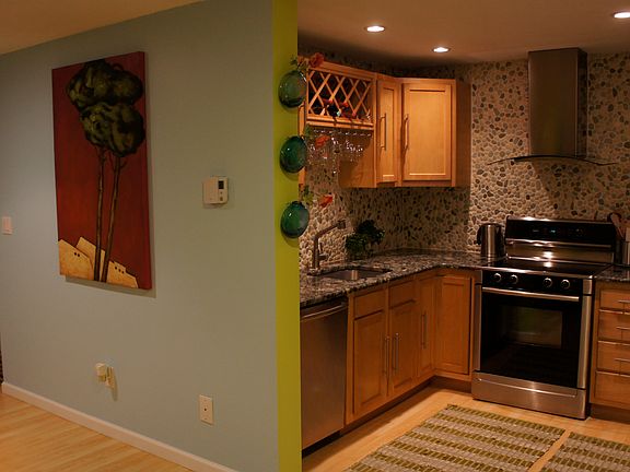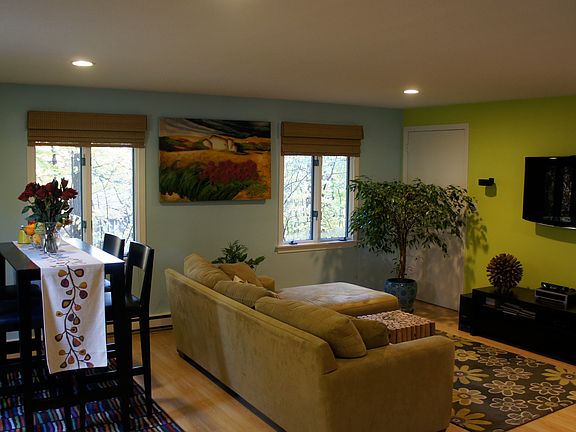 This property is available on a rent-to-own basis. Very sunny and quiet first floor one bedroom apartment. This lodge style condo is like a country escape in the woods. Completely renovated and upgraded with a sleek contemporary look. Modern kitchen is finished with a high-end granite countertop from Brazil, wooden cabinetry and unique pebble rock backsplash highlight the contemporary look of the kitchen. Stainless steel Bosh appliances perfectly blended into the fresh feel of the kitchen. Open space, heating controls in each room, wall AC unit cools entire place. Back door leads out to BBQ area. Great condition! Owner pays for trash, sewage and water. Tenant responsible for electricity.