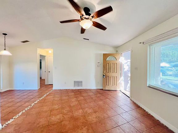 Freshly painted walls, Tile flooring throughout the home. Stainless steel appliances including: Stove, fridge, & microwave. Ceiling fan in all bedrooms. One-car garage was converted into a storage room.
