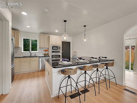 This impeccably renovated, beautifully remodeled property combines contemporary design with ultimate comfort, offering an inviting space perfect for modern living. Featuring 3 bedrooms, 2 bathrooms, and 1,521 square feet of living space, this home is ready to welcome new owners. As you step through the front door, you'll be greeted by a bright and airy open-concept layout, accentuated by stylish finishes and high-quality materials. The kitchen is a chef's delight, boasting ss appliances, sleek black pearl granite countertops, cabinetry, and a massive center island that serves as the heart of the home. Perfect for entertaining, flow seamlessly from the kitchen and island w/ counter height seating into the dining area and adjacent living room. The master suite comes with a fireplace, sizeable closet/storage space and is attached to a versatile bonus room that could be your gym, office, or extra flex space. Each of the additional bedrooms is well-appointed with closet space and windows that fill the rooms with natural light. Outside, your 1/4 acre backyard offers a private haven for relaxation or entertaining, complete with a wood patio and plenty of space for gardening or outdoor activities. Additional features include virtually brand new everything--roof/gutters, whole house interior/exterior paint, insulation/waterproofing, flooring, trim, bathrooms, whole house lighting upgrade, hardscape, as well as updated HVAC, electrical and plumbing. Located in a quiet neighborhood, this home is conveniently close to schools, parks, shopping centers, and major highways, making commuting and daily errands a breeze. This fully remodeled property represents a unique opportunity to own a stylish, affordable, move-in-ready home in one of Colorado Springs' desirable areas. Don’t miss out on this turn-key property—schedule your private showing today and experience the perfect blend of modern updates and comfortable living.