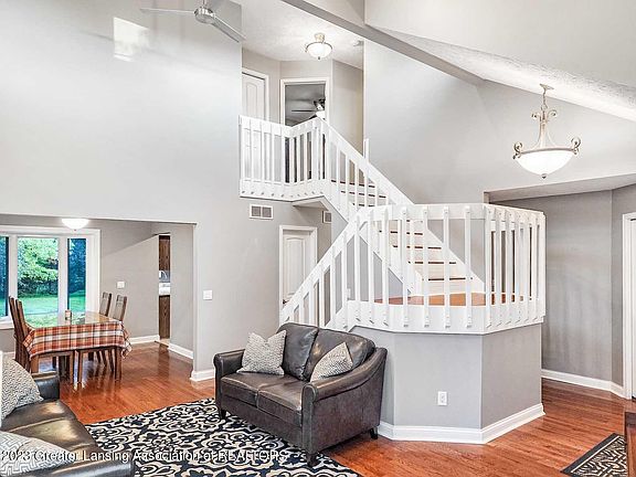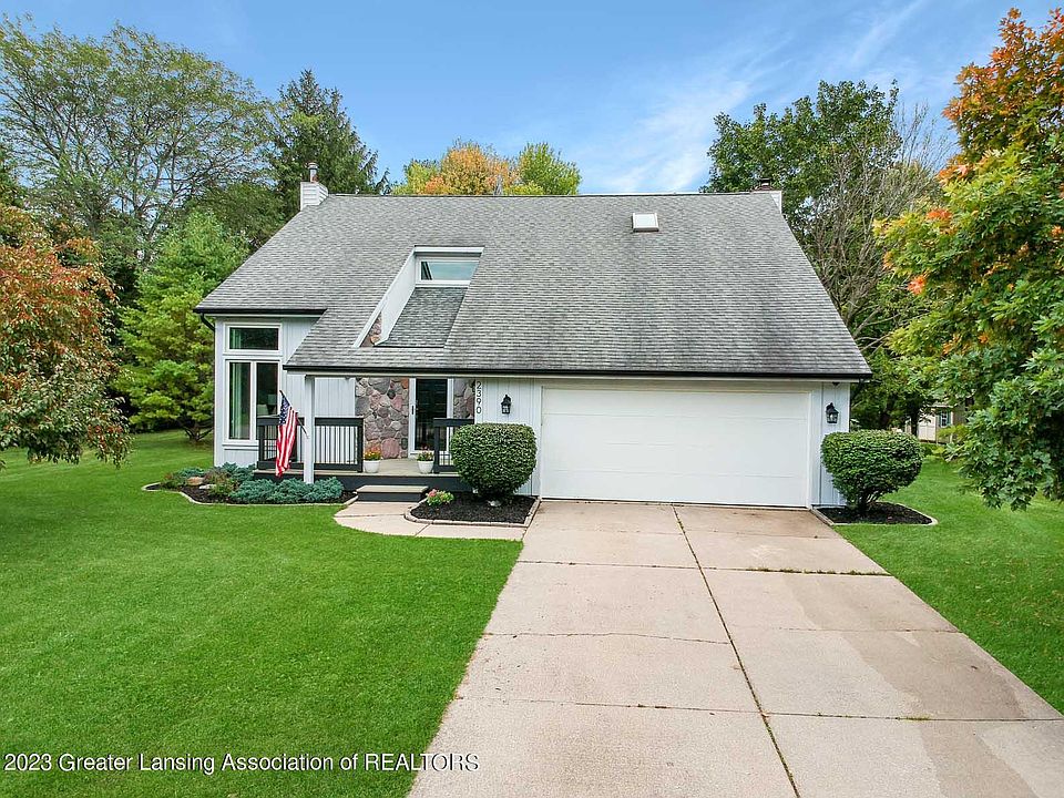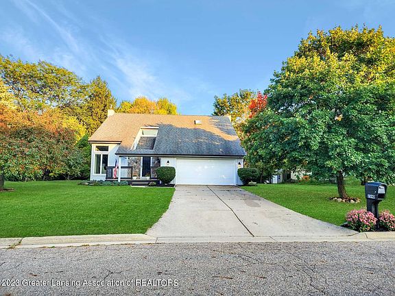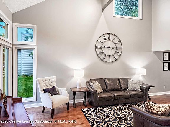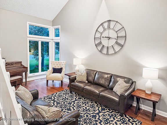 This stunning, custom-built home is one of a kind! Nestled on nearly half an acre, the private backyard is unlike any other in the subdivision - a parklike oasis. Paired with the brick patio and new back deck, relaxing and entertaining outside is a dream come true! The 14'x16' barn with garage door makes storage a breeze. Walk inside for more great entertaining space with a formal dining and living room featuring a beautiful wraparound staircase and large cathedral ceiling that lets in stunning natural light. Oak hardwood floors throughout the main and second levels. Cozy up to the warm stone fireplace in the family room and enjoy views of wildlife in the backyard. The kitchen includes newer appliances including a Bosch dishwasher. The whole house is made comfortable with top-of-the-line HVAC and is wired for smart home technology. The finished basement is an incredible open space with wet bar and full windows for more natural light. Plentiful storage including custom closet shelving throughout and mudroom off the garage. Newly remodeled master bathroom and front and back decks. Friendly neighborhood with no HOA. The perfect blend of modern living and peaceful, natural seclusion just minutes from 127, 96, and MSU!