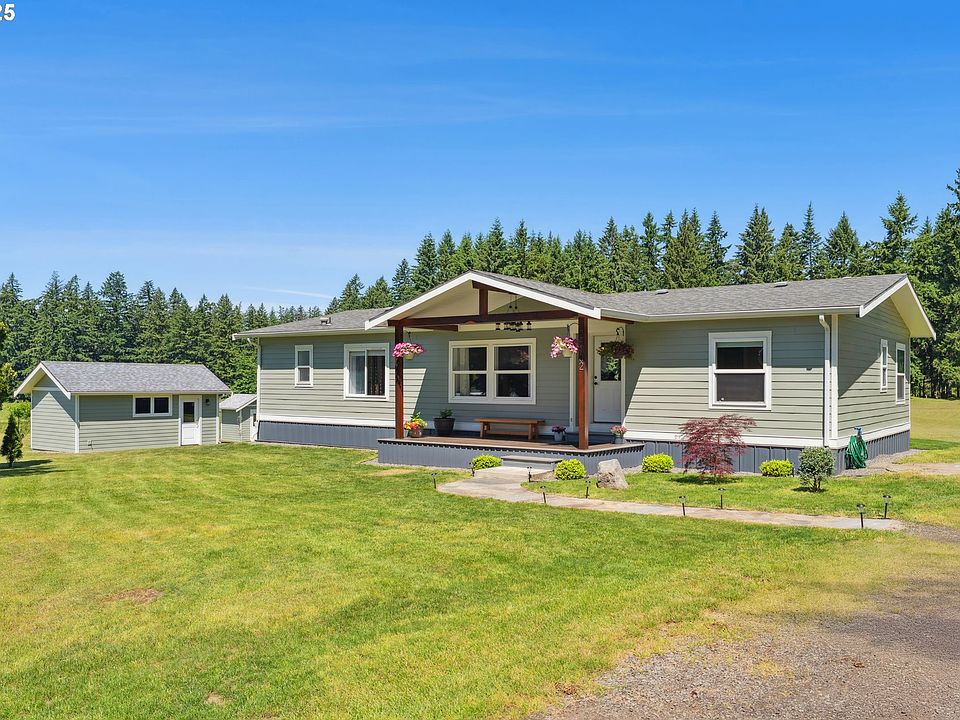 This 4-bedroom, 2-bathroom, 1,512 sq ft double-wide manufactured home sits on real property and offers the perfect balance of modern comfort and serene country living. The home has been thoughtfully updated over the years with no detail overlooked.Enjoy peace of mind with major improvements already done: the heating system, kitchen, appliances, interior/exterior doors, and flooring were all updated 6 years ago. The roof is just 5 years old, siding 4 years, and the expansive deck was added 2 years ago—ideal for relaxing or entertaining. Fresh exterior paint was completed just last year. Both bathrooms have brand new plywood subflooring, providing solid support and long-term durability. The water heater has also been updated with new elements.Set on 5 mostly flat acres, this property offers wide-open space with trees lining in the back for added privacy. Unwind on the deck while taking in peaceful surroundings and stunning sunset views. The 12x20 outbuilding (4 years old) provides excellent storage or workspace. All this, just minutes from Lacamas Lake, Costco, dining, and more—rural living with city convenience!Don’t miss this rare opportunity to own a move-in ready home with room to roam—schedule your showing today!