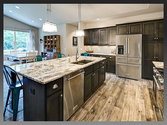 Open floor planSpacious kitchenVaulted ceilingsCozy fireplaceHardwood floorsHuge islandSecluded wooded backyard