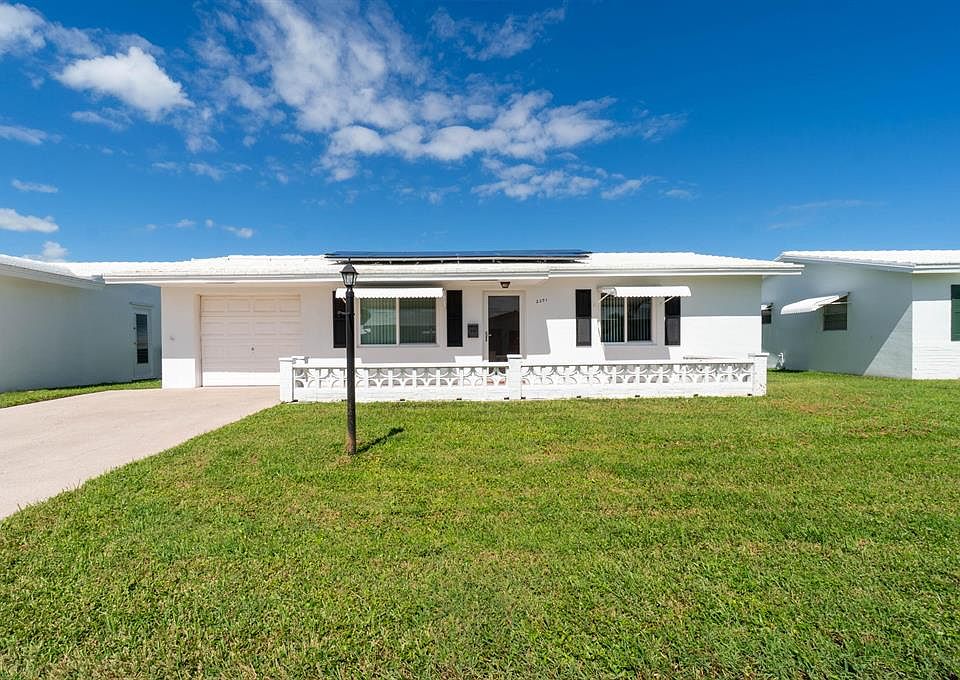 Welcome to this updated Holiday model single-family home in the 55+ community of Palm Beach Leisureville. This 2 bedroom, 1 bathroom, 1-car garage residence offers 1,011 sq. ft. of living space (1,330 sq. ft. total) with impact windows, a solar panel system, new A/C, diagonal tile floors, and a new kitchen with cabinets, appliances, and vinyl flooring. The exterior features a stamped concrete 2-car driveway for added curb appeal. Leisureville residents enjoy three clubhouses, heated/cooled pools, saunas, steam rooms, a fitness center, hobby shops, and a private 18-hole par-three golf course, all included along with free golf and lawn care.