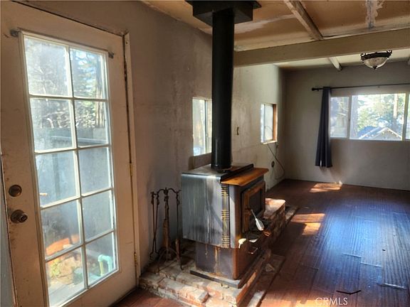 2 bedroom fixer on large, pine-shaded lot in picturesque mountain community 25 minutes north of the 210 in San Bernardino. Raised front porch. Cozy living area with wood-burning stove and french door to side yard. Step-saver kitchen with gas stove, dishwasher, stainless sink, cement counter tops, tiled back-splash, and loads of natural light. Inside laundry with gas dryer hook up. Laminated wood and tile flooring. Gas floor furnace. Shed. Natural rock formations. A true gem-in-rough.