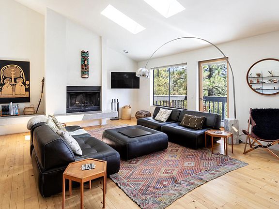 A mountain home in the modern style. c.1987. Featuring multi directional shed roof, tons of windows and skylights, natural light flows in from every angle. The home sits on a massive 3 acre lot providing seclusion and panoramic treetop views of the San Jacinto Mountains, Tahquitz Peak and Lily Rock from both levels of the house. Open living area/kitchen with soaring vaulted ceilings, beautiful pinewood floors and floating hearth are just a few features of this stunning home. Three comfortably sized bedrooms, including a very spacious master bedroom downstairs with en suite and private deck make the layout of the home very functional. All three bathrooms have been remodeled and feel clean, bright and uncluttered. The deck is a great space for outdoor dining while enjoying the incredible view. Surrounded by huge granite boulders and mature trees, this could be your cabin in the sky. Most furnishings are available with the house, negotiable through sale.