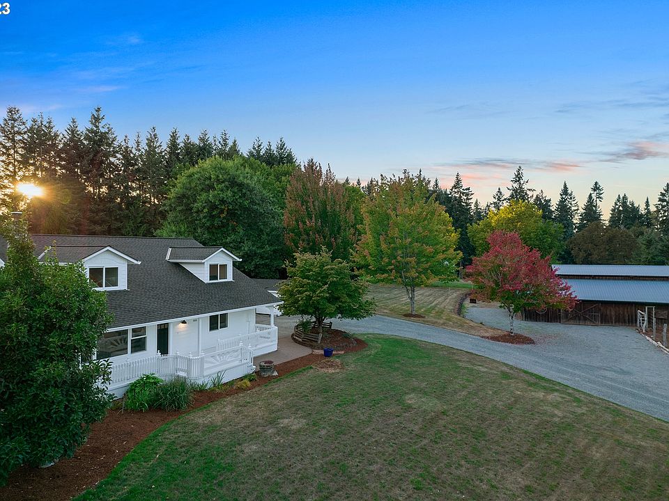 Welcome to your dream farmhouse retreat in Ridgefield, Washington! Nestled on a rare five-acre parcel, this idyllic home beckons with a front porch perfect for scenic relaxation. Entertain on the expansive patio surrounded by lush landscaping, garden beds, mature trees, and a charming firepit. The allure continues with a barn offering endless possibilities.Inside, discover the warmth of dark-stained oak hardwood floors, a family room with vaulted ceilings and a soaring fireplace. The spacious dining area and beautiful kitchen, adorned with quartz countertops, new cabinets, and GE Café appliances, set the stage for delightful gatherings. The main-level primary bedroom boasts an updated ensuite with a stunning shower and dual vanities.Upstairs, three additional bedrooms and a full bathroom showcase views of the picturesque acreage through Millgard windows. Freshly painted interiors, new light and plumbing fixtures, an updated laundry room, this home is a haven of modern comfort and style.Don't miss out on this rare gem. Schedule your viewing now!