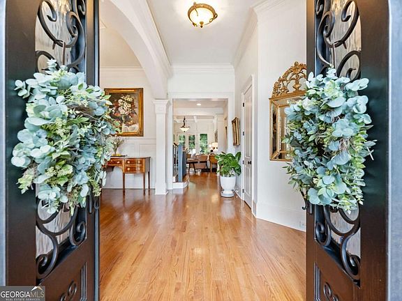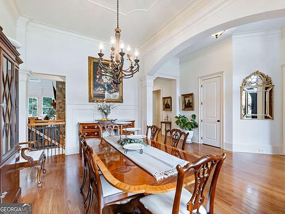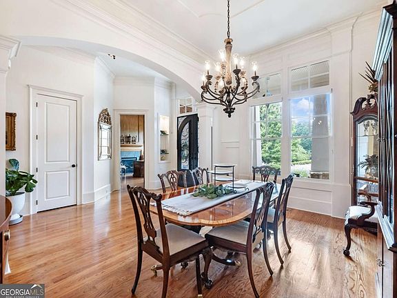Discover timeless elegance and exceptional craftsmanship in this storybook home nestled in one of Braselton's most desirable communities, CHATEAU ELAN RESORT COMMUNITY. This inviting executive home offers 5 bedrooms and 6.5 baths, including two luxurious owner's suites, one on the main level and another on the finished terrace level. Step inside through grand double doors to find gleaming hardwood floors, detailed crown molding, architectural columns, and graceful arched entryways. The large formal dining room is framed in floor-to-ceiling windows. A handsome main-level office features judge's paneling, a beamed cathedral ceiling, fireplace, and abundant natural light. The spacious great room is anchored by a dramatic double-sided fireplace connecting two generous living areas, both opening to the natural stone patio, overlooking the lush, well manicured backyard. The gourmet kitchen is a chef's dream with quartz countertops, a large island with bar seating, two-toned cabinetry, high-end appliances including a charming French-country style wrapped gas cooktop, double ovens, a warming drawer, a built-in desk, and one of two Sub-Zero refrigerators. Enjoy easy indoor-outdoor living with a beautiful screened porch and an open natural stone patio, perfect for relaxing or entertaining. Both stone and paved, gently sloping pathways lead to the fenced, landscaped backyard, and the terrace level patio, complete with a hot tub for soaking after a long day of golf. On the 3rd level, you'll find three oversized bedrooms, each with its own bathroom and walk-in closet, plus generous attic storage with a unique secondary staircase for even more space. The finished terrace level offers flexible living areas with stone accents, built-ins, its own double-sided fireplace, a kitchenette (with that 2nd Sub-Zero fridge), a private owner's suite with luxury bath, a theater room, and additional unfinished space for storage or future expansion. Each level of the home has its own HVAC system. Additionally, there is a high-end household A/V system, ensuring comfort and modern convenience throughout. Beautifully blending classic charm and modern luxury, this exceptional Braselton home is ready to welcome you. Lifepath, Hospital, Grocery shopping, Restaurants, golf, all within minutes.