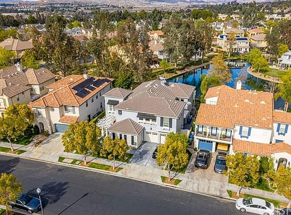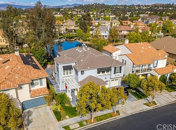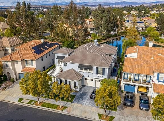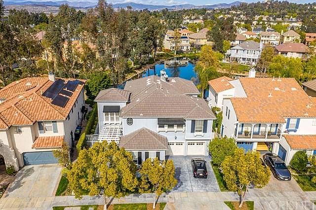 The largest model, right on the water & truly the best of the best! Perfectly located in the gated "Island" community, this remodeled home has 180 degree unobstructed water views & a larger usable lot than most. Inside is amazing! The kitchen has been redone with new cabinets, quartz counters, gorgeous backsplash, Wolf stove & Subzero refrigerator. Wood & tile throughout the home of the highest quality. The custom dining room ceiling is one of many tasteful & creative touches in almost every room. There is a full bed (used as an office currently) with attached bath down plus another half bath for guests. High end crown molding, LED lighting throughout & the HVAC is new too. Excellent pride of ownership throughout. The master has a full length deck to really take advantage of the water views! Double walk-in closets & stone floors & white cabinets in the bath. 3-car split garage. Bridgeport Valencia is known for it's special architecture, clubhouse with pool, award winning schools, park & walking paths - all with a reasonable HOA & no MELLO ROOS taxes. This home is a 10!