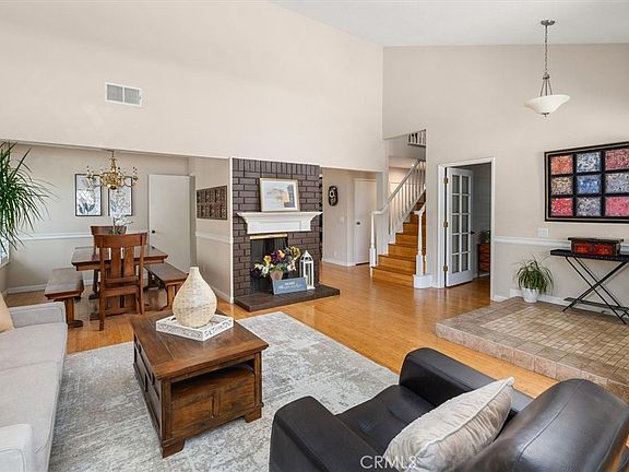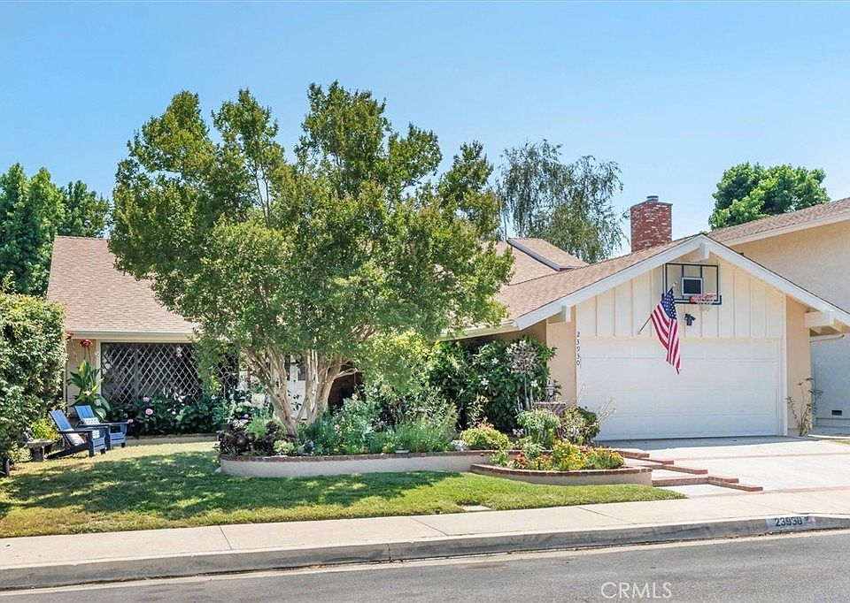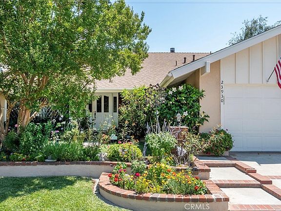 Welcome to 23930 Avenida Crescenta, nestled in the heart of Valencia! This delightful home boasts great curb appeal with well-maintained landscaping, a striking diamond beveled glass front window, and an inviting covered front porch—an ideal spot to relax with your favorite drink.