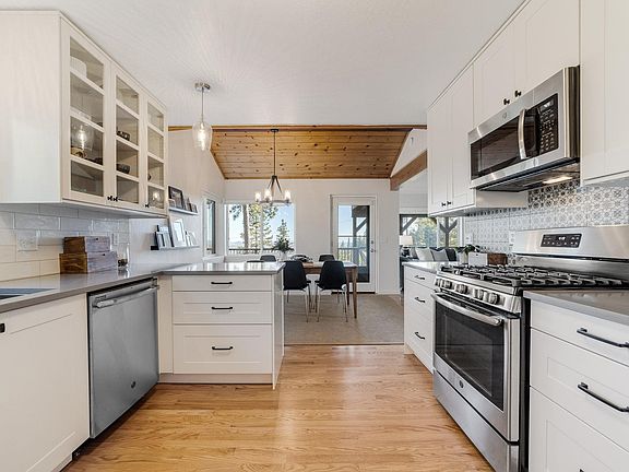 Soak in the breathtaking views and enjoy this spectacular home that looks like it's right off the pages of "House Beautiful". With over $90,000 worth of upgrades, it feels like a brand new home. The newly installed windows bring in the view and the natural light. Imagine watching the snow fall in the winter as you cozy up to the wood burning stove. The wooden cathedral ceiling and the deck access make the open dining room a show stopper. Completely remodeled, this gorgeous kitchen includes all stainless steel appliances, a deep sink, tile backsplash, quartz counters and hardwood flooring. The primary bedroom has French doors leading to a private deck and the best views. There are 2 bedrooms, a bonus room & one & half bathrooms. On the main deck, there is a place to dine and also a cozy covered area with comfortable couches to entertain & use year round. The house is wired and plumbed for a portable propane generator with the 12,000 KW dual-fuel unit included. The following improvements/upgrades were done within the last 4 years: roof, exterior painting, window shades, windows, two story deck, garage cabinets, first floor central A/C, and water heater & kitchen. There is a 2 car attached garage. All the furniture, all the appliances, snow blower, wood splitter and outdoor barbecue are included in the purchase (even the dishes, flatwear, pots & pans). This location is near the Cedar Ridge ditch that makes a great walking trail next to open water and near Twain Harte.
