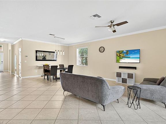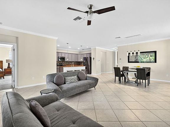 Welcome Home to Orange Blossom Ranch! Discover your dream home in Orange Blossom Ranch— one of Naples’ most desirable gated communities, offering low HOA fees, resort-style amenities, and a vibrant family-friendly lifestyle. This meticulously maintained 4-bedroom, 3-bath single-family home (popular Trevi model by Lennar) is privately located on the edge of the community and sits on a wide freshwater canal with desirable eastern rear exposure- perfect for enjoying peaceful sunrises from your lanai. Offering over 2,000 sq. ft. of open-concept living designed for both comfort and elegance. The bright, spacious layout features soaring ceilings, crown molding, and easy-to-maintain tile flooring throughout the main living areas. The gourmet kitchen showcases stainless steel appliances, granite countertops, a large center island, and a generous size pantry—perfect for cooking, entertaining, or gathering with family. The open great room and dining area flow seamlessly to the extended screened lanai, creating a perfect indoor-outdoor lifestyle. Enjoy tranquil views as you relax or entertain in your private outdoor retreat surrounded by lush landscaping, including two mango trees, an avocado tree, and a lemon tree. The primary suite offers two walk-in closets and a spa-inspired en-suite bath with dual sinks, large soaking tub, and a walk-in shower. A private guest bedroom with its own full bath provides comfort and privacy, while two additional bedrooms share the 3rd full bathroom—making this home ideal for families or guests. Additional features include hurricane shutters, a Vivint smart home security system, laundry room with stackable washer and dryer, and a 2-car garage. The brick paver driveway and entryway complete the home's beautiful curb appeal. You won’t find another Trevi model with a lanai this spacious! This exceptional enclosed outdoor retreat offers the perfect blend of elegance and comfort- ideal for hosting family gatherings, entertaining friends, or simply relaxing under the Florida sun. Residents of Orange Blossom Ranch enjoy two resort-style heated pools and spas, clubhouse, fitness center, tennis, pickleball, basketball, volleyball, bocce courts, fishing pier, playground, and miles of walking trails. The community hosts year-round social events- from food truck nights to game nights- making it easy to meet neighbors and enjoy a true sense of community. Conveniently located near top rated schools, Ave Maria University, and the brand-new Publix Plaza (featuring Starbucks, Tropical Smoothie, 5/3 Bank, and more). You’re also just minutes from Big Corkscrew Island Regional Park, offering miles of trails, sports fields, splash pads, and nature adventures. Low HOA fees include lawn care, irrigation, and full access to all amenities. The community is pet-friendly and not in a flood zone—no flood insurance required. With its unbeatable combination of location and amenities, this move-in-ready home perfectly embodies Naples living at its finest!