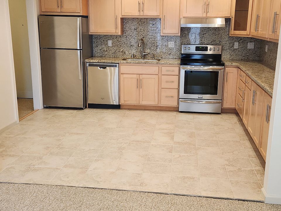 - Remodeled eat-in kitchen with sleek granite countertops, new cabinetry, and electric appliances