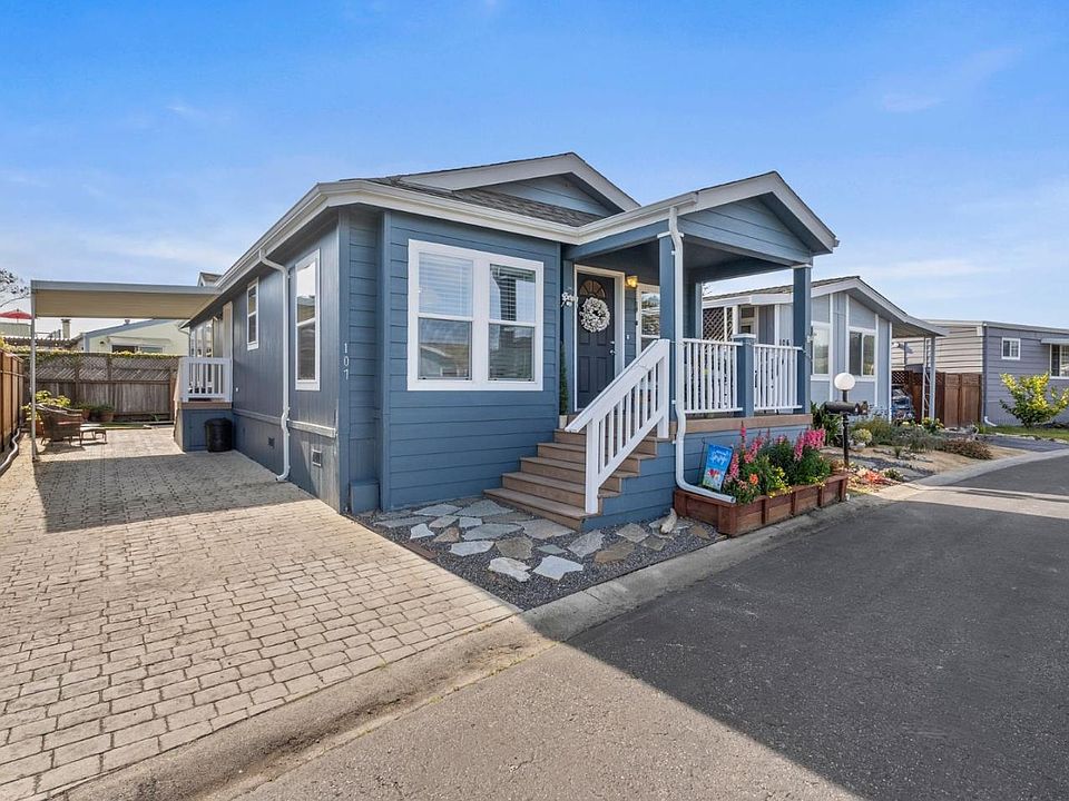 This well-maintained home is like a warm and cozy hug that welcomes everyone into its light and airy living space. Located in one of the premier gated parks in Santa Cruz County, this home is a short dog walk away within the park's animal-friendly community to access the expansive beach and stunning ocean vistas. The property offers an open kitchen, dining and living area, master bedroom ensuite, a second bedroom/bonus room with guest bath, wood burning fireplace, laundry room, and office nook. The exterior covered front porch, secluded rear patio, covered carport, and attractive new privacy fence further enhance this home's special appeal. The owner recently added gutters, downspouts, and fumigated in 2023. The bonus storage shed is yet another plus. Fun perks: To honor your mind and body health resolutions, the community clubhouse offers regularly scheduled social events, and the pool and gym make it easy to stay fit. For those of you whose bucket list includes living near the ocean, and for those of you who didn't even realize that it could be, you owe it to yourself to tour this wonderful property that is waiting for you to make it your next adventure. Please note that the property is in a 55+ community and that the lot is leased through the DeAnza Mobile Park Management.