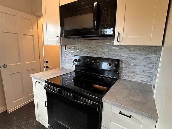 Step inside to a bright living room with warm wood flooring and a welcoming layout. The updated kitchen features solid surface countertops, white shaker cabinets, stylish tile backsplash, and built-in appliances for a clean, modern look.