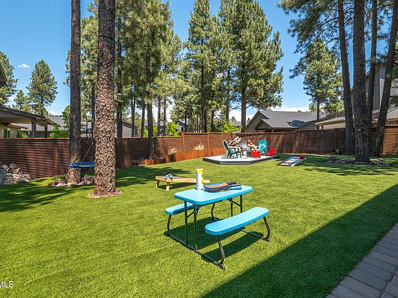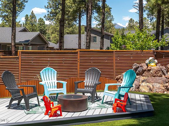 Looking for a large, private backyard with four bedrooms plus a den/office? No more waiting or sacrificing through noisy construction, this home is move-in ready and loaded with upgrades that you won't find in a new build home. Better yet, ask about seller concessions. Completed in 2022, this stunning home offers thoughtful and flexible living space to match your lifestyle. Inside, walk into 10-foot-high ceilings while enjoying plush quality carpeting in the bedrooms, great room, hallways, and stairs, paired beautifully with 18″ tile flooring throughout the home. The gourmet kitchen features 42″ upper cabinets, granite countertops, soft-close drawers, new upgraded hands-free kitchen faucet and premium appliances including a Samsung refrigerator and Whirlpool stainless steel gas range with convection. The Great Room is a showstopper, offering views of the San Francisco peaks, a cozy gas fireplace, and an open layout. Step outside to your professionally landscaped backyard oasis with mature Ponderosa Pines, more peak views, a custom shed, a custom composite deck with gas hookup for a fire pit, and lush artificial turf ideal for outdoor entertaining. Upstairs you will find four bedrooms, 3 with large walk-in closets. The primary suite includes a spa-inspired ensuite bath with a tile-surround shower. Vanity flows into a massive 9×10 closet! The upstairs laundry room both functional and stylish, featuring a Samsung washer & dryer, upper cabinets, a utility sink with pull-out faucet, and a spacious closet. The Energy Recovery Ventilator (ERV system) improves indoor air quality. The 2-car garage comes with 240V plug for your EV and is insulated with a Polyurea-coated floor for durability and easy cleaning, plus new garage shelving for added organization. The garage also hosts a tankless water heater with a recirculating pump ensuring you never run out of hot water. Loaded with upgrades (RO filtration system, water softener, new custom light fixtures, new kitchen faucet, new shower heads, and new blinds/draperies). This SMART home is fully compatible with Alexa, Google, and Apple devices, allowing you to control lights, water, HVAC and garage door with ease, plus a ring doorbell and safety alarm. The front and back yards feature a two-zone irrigation system for easy maintenance. This home is truly move-in ready offering high-end finishes, smart home features, and low maintenance. The community does allow short-term rentals and Airbnbs for those who are interested. Enjoy the community playground, pickleball and dog park around the corner with access to several hiking trails.