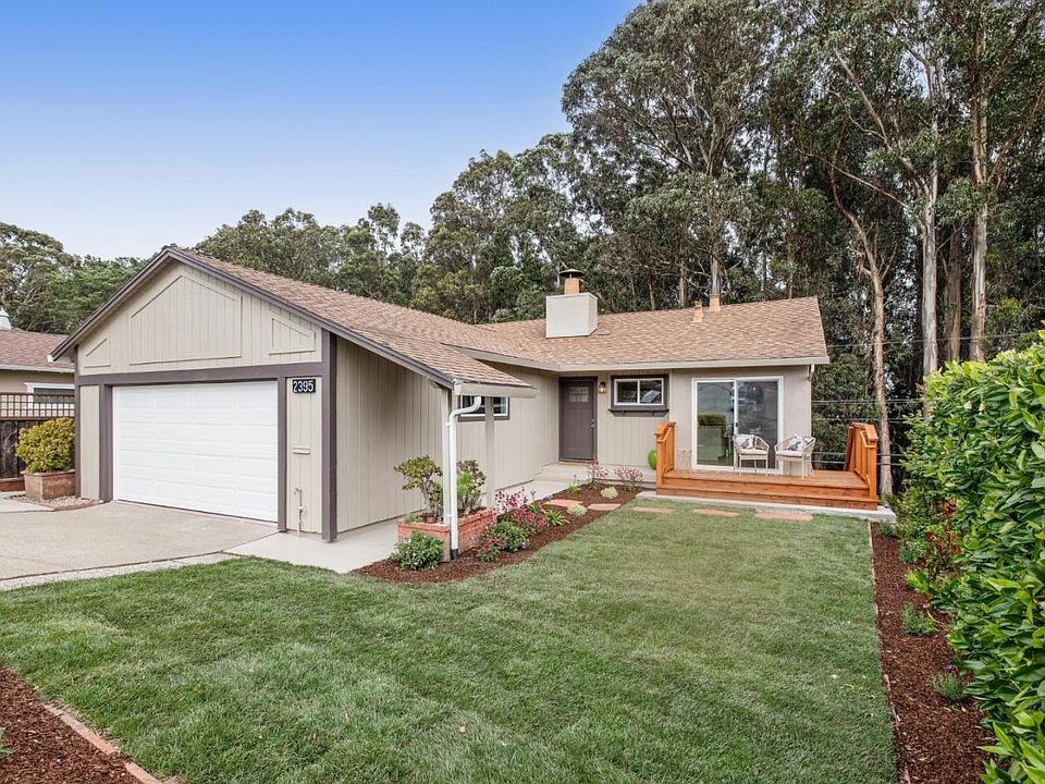 In highly desirable Crestmoor Park, near hiking trails with ocean and bay views, this recently updated home brings the outside into nearly every room from large windows showcasing the outdoors and filling the home with natural light. Assets include refinished oak floors, freshly painted interior and exterior, new lighting and exquisitely remodeled kitchen and baths with pristine stone and tile finishes. The two-level layout features a living room with fireplace and dining area with wall of windows flaunting a grove of eucalyptus trees, and bright eat-in kitchen with quartz counters, stainless steel appliances and French door to the front garden. Two bedrooms, including the primary, are on the main level along with a beautifully remodeled bathroom, and two bedrooms are on the lower level--one is staged as a family room and offers outdoor access. The lower-level bathroom with step-in shower is finished in stunning stone and tile. Front and back yards feature new soft and hardscapes.