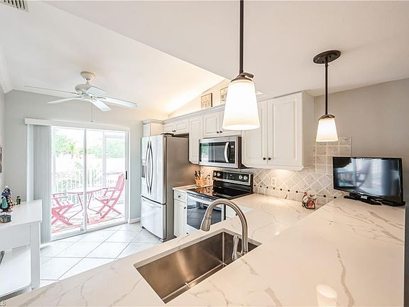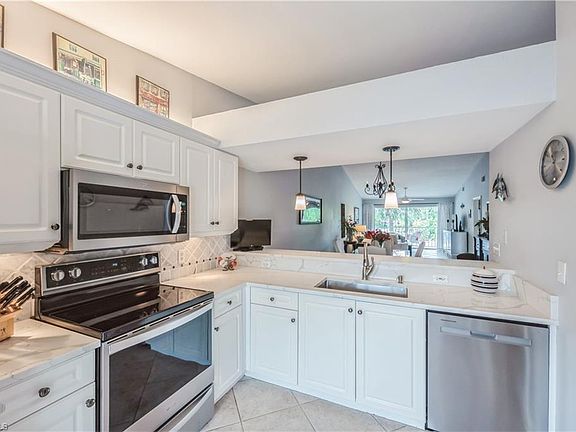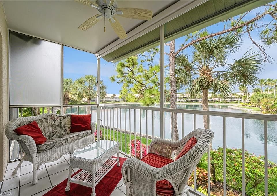 Discover the serenity of Falling Waters, a picturesque, gated community adorned with tropical landscaping and cascading waterfalls. Nestled amidst the captivating scenery is this charming second-floor end unit, with panoramic views of the lake and fountain, creating a breathtaking backdrop for your everyday life. Step inside to the bright interior featuring a pristine white kitchen adorned with quartz countertops and stainless-steel appliances. The kitchen seamlessly transitions to a welcoming front screened lanai, where you can savor your morning coffee. The spacious main bedroom offers a spacious walk-in closet, ensuite bath, and sliders leading to the tranquil back lanai. Tastefully updated baths and flooring. This unit also includes a second bedroom, additional bath, and laundry room, providing ample space for comfortable living. Two sliding glass doors open to the expansive back lanai, where you'll enjoy our renowned Naples sunsets. Turnkey furnished ensures a seamless transition into your new home. Residents of Falling Waters love the resort-style amenities, including one of the region's largest pools, perfect for relaxation and recreation. Embrace an active lifestyle with clubhouse activities, tennis courts, bocce ball, a putting green, and shuffleboard available for your enjoyment. Conveniently located just 5 miles from the vibrant dining and shopping destinations of Naples 5th Avenue, as well as the pristine white sandy beaches of the Gulf of Mexico, Falling Waters epitomizes the essence of paradise living. Don't miss the opportunity to make this exquisite retreat your own and experience the unparalleled beauty and tranquility of life in Falling Waters.