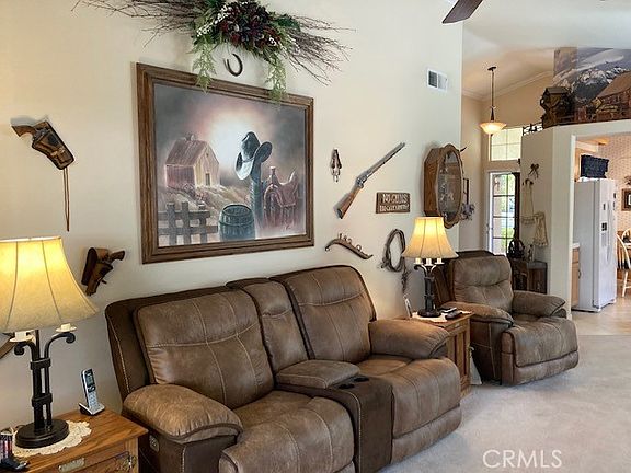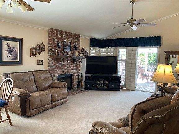 There are so many great features in this beautiful single-story home located in The Colony, one of SoCal's finest gated communities for ages 55+. The gated entry courtyard welcomes you with brick and concrete walkways. There are plantation shutters and vaulted ceilings throughout the home. The living room/dining combination has a cozy fireplace with a custom wood mantle. The sliding doors lead to a large covered patio that gives you so much extra space for family gatherings or entertaining. The patio is very private & inviting with brick highlights & a serving area. The kitchen has a window over the sink & cozy eating nook for casual meals. The primary bedroom offers a walk-in closet + a wall closet. The primary bath has dual sinks with updated fixtures and a large walk-in shower. The guest bedroom is being used as a den and has a closet. The guest bath has a tub and updated fixtures. Indoor laundry room has storage with washer and dryer included in the sale. This home is decorated in a charming Western theme and all furniture and decor can be included if so desired. NEARLY NEW AC is only 2 years old. You will love the garage with so many built-in storage cabinets & a workbench area. There is an HOA maintained greenbelt behind your home. There are clean concrete walkways on both sides of the home. The Colony is a PREMIER GATED SENIOR COMMUNITY for ages 55+ with a RESORT CLASS CLUBHOUSE, year-round pool, 2 spas, lighted pickle ball/paddle tennis and tennis courts. You can enjoy the gym, library, ping pong, billiards, hair/nail salon. There are groups & activities for all interests with an auditorium for shows, dances, banquets, concerts, movies, bingo & parties for all occasions. A privately owned 18-hole golf course is inside the gate. The HOA waters & maintains all front landscaping. Guard gated entry and 24-hour security patrol give you peace of mind. You will love the friendly neighbors and sense of community as you enjoy TRUE RESORT STYLE SENIOR LIVING in The Colony.