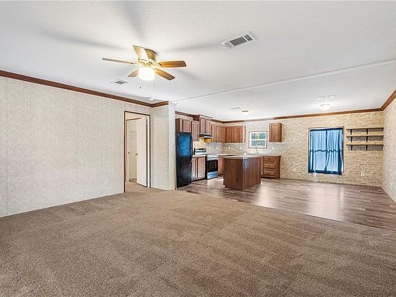 This beautiful 5 bedroom, 3 bath manufactured home set on a permanent foundation is waiting on the next owner to call home! Built in 2021, this spacious home is in great condition including LVP flooring, and 2 living areas. Open concept, kitchen with plenty of cabinet space, large island and breakfast area. Primary bedroom offers a private retreat with a huge walk in closet, and a bathroom featuring a separate shower and large soaking tub. Four additional bedrooms provide plenty of space for guests, family or hobbies. A separate laundry room for convenience. This home sits on 10 acres, with 2.4 acres completely fenced, also has a goat barn and chicken coop. Shed does not stay.