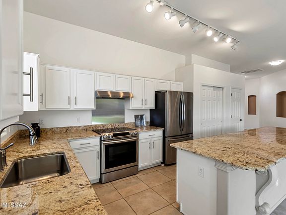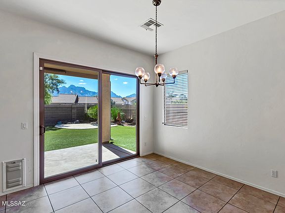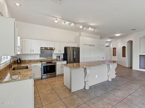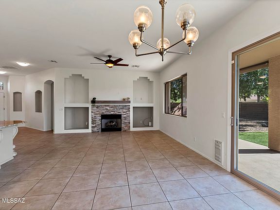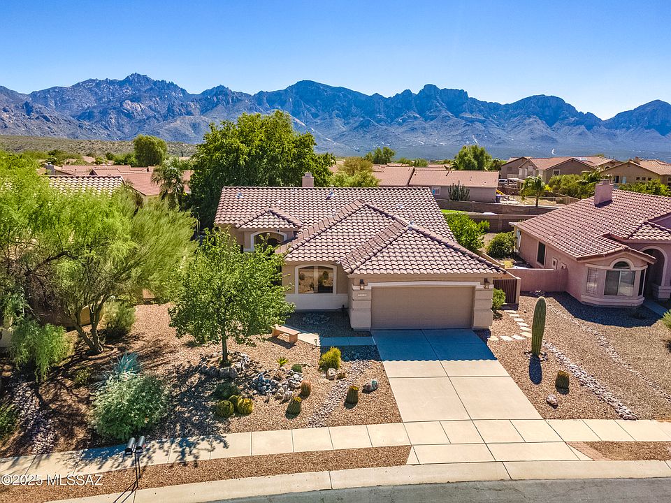 Impeccable Contemporary Single-Story in Coveted Rancho Vistoso. Step into this beautifully maintained single-story home in the highly desirable Rancho Vistoso community. Nestled on a .19-acre lot with sweeping Pusch Ridge mountain views, this 3-bedroom, 2-bathroom residence effortlessly blends comfort and sophistication. The great room concept features soaring ceilings, 20'' porcelain tile flooring, a cozy stacked-stone gas fireplace, recessed lighting, illuminated ceiling fans, custom wood window blinds, and energy-efficient dual-pane windows. The open kitchen is a chef's dream, boasting a large center island with ample bar seating, granite countertops, a pantry closet, stainless steel appliances, and abundant white cabinetry. Adjacent dining and living spaces create a (continued)... seamless flow for entertaining and everyday living. The spacious primary retreat is a serene sanctuary with a private ensuite featuring dual granite vanities with vessel sinks, a walk-in shower, a separate soaking tub, a large closet, and modern fixtures. The split-bedroom floor plan offers privacy for all, with secondary bedrooms featuring carpeting, ceiling fans, and shutters. Outside, the professionally landscaped backyard is a tranquil oasis with an extended covered patio, low-maintenance turf, flagstone accents, mature vegetation, and fruit trees, including Meyer lemon, orange, and peach. Masonry walls provide privacy while framing stunning sunset views over Pusch Ridge. The front yard is equally inviting, with native desert landscaping, multiple barrel cacti, and a decorative gravel walkway. Additional highlights include a separate laundry room with cabinets and an included washer/dryer, high-efficiency American Standard HVAC (2018), garage storage cabinets, newer window screens, tile roof, water filtration system, and a low HOA. Residents enjoy neighborhood sidewalks, a nearby park with a playground and green space, and convenient access to Oro Valley Marketplace, Catalina State Park, and the local hospital. This home offers a rare combination of style, function, and a premier location.