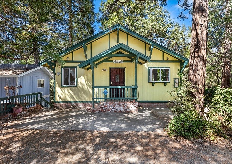 Charming 2 story mountain cabin near Lake Gregory! Vaulted knotty pine ceilings and paneling throughout upper level. Cozy and open main living area complete with brick fireplace. Spacious dining room. Kitchen features tile flooring, great counter space and cabinet storage, breakfast bar and garden window. Dual paned windows throughout. All 3 bedrooms located on lower level. Laundry with washer & dryer. Lots of storage for linens, etc. Separate entry to side stairs from 3rd bedroom. Full bathrooms upstairs and downstairs. Wood deck off of dining/living area. Workshop shed on lower level yard. Level parking and just 3 steps to front door. Conveniently located, close enough to take a stroll into town for shopping and walks around the lake. While this property needs some TLC, its classic features and layout make for a wonderful opportunity to create your vision and restore it to its full charm. Call to schedule a private tour today!