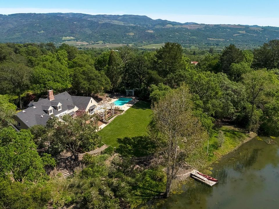 Coveted Lake Josephine setting within exclusive Sobre Vista Estates. A paved drive through a pastoral scene leads to the gated entry of this 2.65+/- acre elegant, lakeside estate. Serene views, rare lateral shoreline, and your own island. Timeless 4 bedroom, 3.5 bath residence is surrounded by views and easily accesses the grounds to enjoy the outdoors from terraces, stonework patios, gardens. Skylit kitchen opens to the dining/family room with stone fireplace and additional breakfast nook. Additional formal living and dining room also opens to the outdoors creating additional indoor/outdoor experiences. The main-level primary suite with views, built-ins and two dressing rooms opens to the grounds. The skylit guest level - via steps or elevator - includes a media room. A detached carriage house provides storage, flexible studio space or guest overflow. Established gardens bloom with year-round color and fragrance and frame the pool/spa terrace and the multiple outdoor entertaining and lounging areas. Conveniently minutes to Sonoma Plaza, acclaimed wineries, farms golf and all wine country amenities. 1+/- hour north of San Francisco.