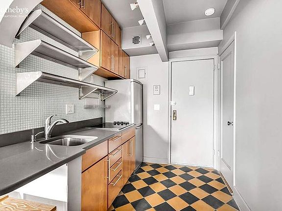 Sunny, charming, spacious studio apartment with exquisite details. High ceilings, marble tile full-size bathroom with Kohler fixtures, and a well-equipped kitchen with breakfast bar, Franke Sink, Miele 4 burner cooktop, LG Refrigerator, superb storage, stainless steel shelves, and wood cabinets. Walk-in closet featuring custom shelving. The living area enjoys a built-in Murphy Bed with TV and custom shelving and cabinets, skim-coated walls, and screened windows. Lighting on dimmers. Hardwood floors. All this with a quintessential southern exposure over a unique, tree-lined street in Greenwich Village.