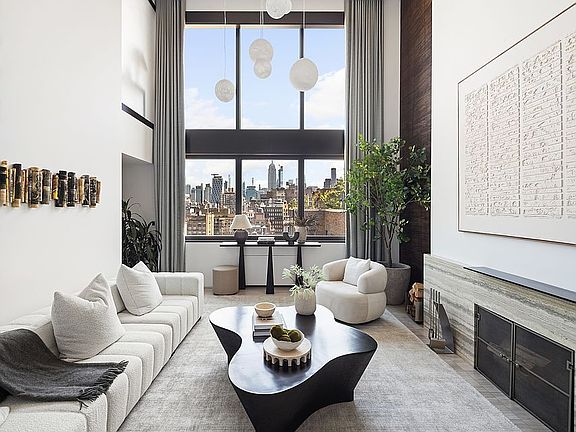 • Stately, double-height great room with 18' ceilings, a wood-burning fireplace complimented by a contemporary marble mantle, heated travertine floors, and oversized windows with Northern views of the Midtown skyline, perfectly framing the Empire State Building.