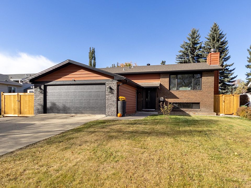 Amazing Akinsdale home located near Elmer S. Gish school, with parks and amenities close by - ideal location busy families! This bi level has a total of SIX bedrooms! Huge back yard with newer deck & gas BBQ line. The main floor offers spacious room sizes; great room with stone faced wood burning fireplace; open dining area with built in cabinets; white kitchen cabinets - lots of storage. The primary bedroom has a large closet and a full ensuite bathroom. Two more good sized bedrooms and a second full bath complete this level. The full basement with lots of natural light has three more bedrooms and another full bathroom! Plus a huge rec room with roughed in wet bar; a laundry room and lots of storage. Double attached garage for convenience and safety - your family will love this home!