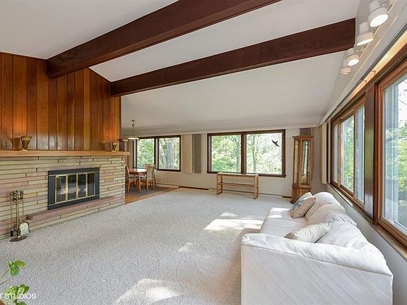 GREAT LOCATION! Short walk to Lake Michigan! This Midwest Mid-Century Hillside Ranch is tucked into a dune top with 2 stories & deck overlooking beautiful lawn. House is cleverly screened from road by detached 2 car garage offering privacy. Over 2,600 Finished Sq Ft, this spacious home features a Grand Living Room with cathedral ceiling & wood beams, fireplace, lots of windows with scenic views. Open Airy Galley Kitchen is easily accessible from Dining Area & Large Screened Porch. Wide hallway with hardwood flooring, built-in linen cabinet, and skylight leads to Beds and Baths. Gracious stairway down to lower level Walkout basement with abundant natural light. Easy access to 90/94, only 45-60 minutes by car to downtown Chicago, or take South Shore Train at entrance (free parking). Many amenities: 18 beach access-ways, tennis & basketball courts, soccer fields, hiking trails, parks & playgrounds, community gardens, clubs & organizations; police, fire & street departments.
