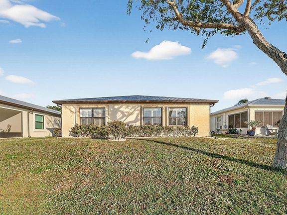 Immaculately maintained lakefront 2 bedroom, 2 bathroom with a fully enclosed porch, on a quiet cul-de-sac at the front of the community, just steps from the clubhouse! Features include a durable metal roof, brand new AC, accordion shutters, and elegant plantation shutters. Interior boasts fresh paint, new vinyl flooring in bedrooms, and updated toilets, plus an attic ventilation fan for added comfort. Perfectly cared-for and move-in ready. Land lease for the next buyer is $798.Spanish Lakes amenities include a clubhouse, pool, tennis courts, golf course, fitness center, walking paths, social clubs, and community events--perfect for an active 55+ lifestyle!