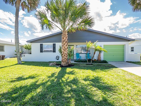 Welcome home to this Ormond By The Sea Beauty!! Only a half block from the beach!! This Mid Century Modern beachside home has been fully renovated with too many upgrades to mention. Enjoy a open floorplan. This home has all new wood kitchen cabinets, vanities and all new plumbing fixtures. Kitchen is outfitted with all new stainless Steel appliances and quartz countertops. Master bath is massive with double sink vanities, Led lights and mirrors. Walkin shower is huge with new fixtures and tile. Master Bath leads to a private patio to enjoy your morning coffee. Master bedroom is split and very spacious. 2nd Bedroom is massive and 2nd bathroom is very stylish and functional with new tile, vanity and led lights and mirror. This home boasts lots of living space as it has a large living room in the front of the home and another family room with wood fireplace open to kitchen and dining room for an open feel. Family room leads out to patio and living room has covered patio in front of house HVAC is new 2025. Electrical service was just upgraded a year ago. Roof is in excellent shape, irrigation system runs off well and there is an outdoor shower to rinse off sand from Beach. Come and enjoy the Ormond by the beach lifestyle for a very affordable price!!