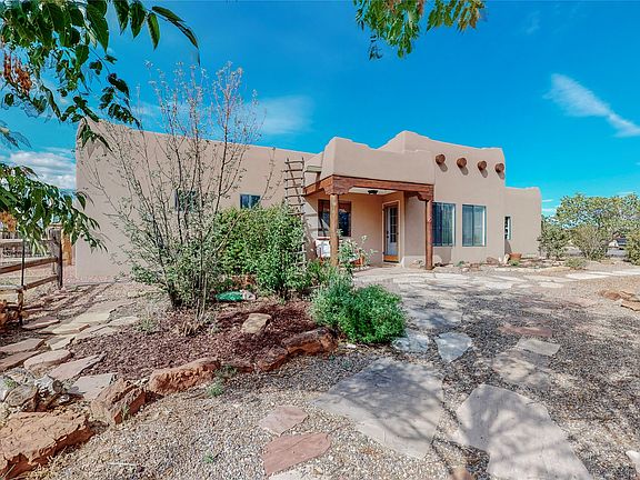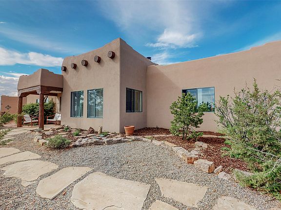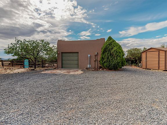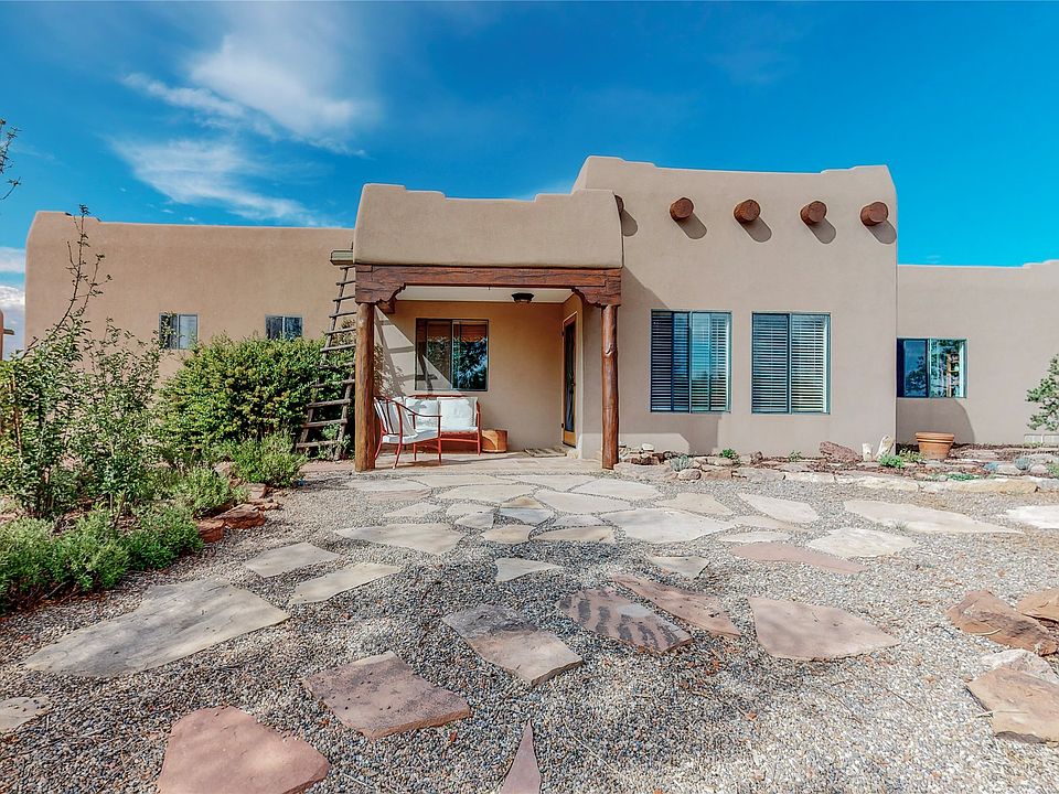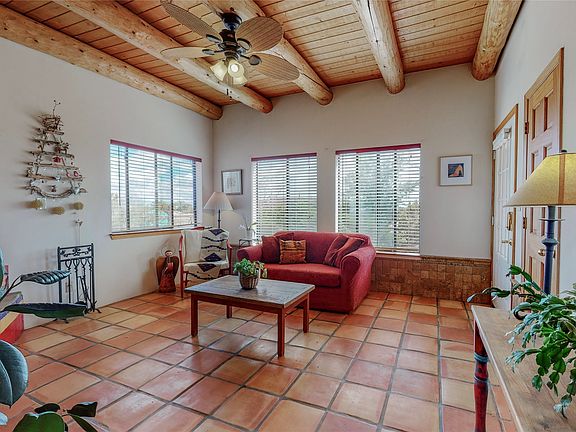 A delightful blend of English country cottage and Santa Fe pueblo design plus a detached contemporary studio. Showing pride of ownership this cheery home is in move in ready condition. Gleaming saltillo tile and brick floors, refreshed kitchen with granite counters and new cabinetry flows to private gardens and shady patio with lovely mountain views. Totally refreshed bathrooms, natural gas forced air heating plus ducted air conditioning, newly maintained roof with a 2 year warranty and fireplace professionally cleaned. A large workshop/den with pellet stove heating opens to a biker's dream garage with central lift. The casita/studio includes an art sink and private loo, pellet stove, a portable window a/c unit and plenty of storage. Easy access to all the Eldorado amenities plus local shopping and community facilities, only minutes into Santa Fe.