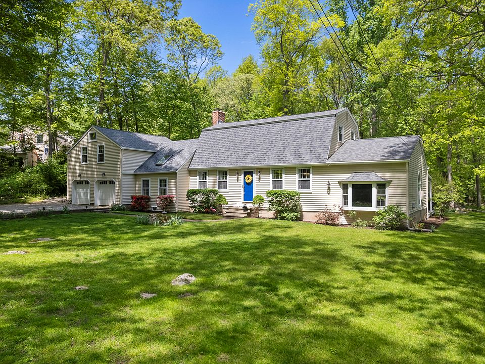One of the most scenic Old Lyme roads leads to this rambling colonial adjacent Peppermint Ridge Open Space. Century old stone walls frame the Gambrel entry. The center hall design is flanked left and right by formal living and dining rooms. A nicely updated kitchen features an efficient center island and stainless appliances. The step-down great room is a great transition for outdoor entertaining. On the north end of the home, find a den/library with window seat, built-in bookcases, wood paneling and a bar area. A spiral stair leads to a spacious primary bedroom suite with sitting room/office, full bath, walk-in closet and private deck overlooking the rear yard. Three additional bedrooms and a full bath are found in the main body of the home. A full basement houses mechanicals including a 2021 Biasi/Riello boiler and hot water heater. Outside, expansive decks overlook a well landscaped yard! Incredible updates include new primary bath, replacement upper-level decking, 2017 roof and gutter guards, window replacements, house paint 2023. Mile Creek School and Cross Lane Park are 1 mile away and beaches are two miles by bicycle. This area is long enjoyed by cyclists and runners for its scenic beauty. Close to town and just 20 minutes to Groton/New London, 38 minutes to New Haven and 2 hours to NY/Boston. 12 minutes to Saybrook Station. Solid, well-maintained home in a tremendous area!