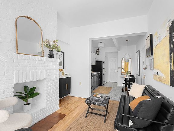 Step into the heart of the West Village with this enchanting prewar studio that seamlessly blends the timeless charm of loft living with modern comforts. As you enter, let yourself be drawn into a world where the rustic allure of an exposed brick decorative fireplace meets the refined beauty of newly refinished hardwood floors. The nearly 10-foot-high ceilings amplify the space, inviting in an abundance of natural light to create a bright, open, and inviting atmosphere. Outfitted with stainless steel appliances, the open kitchen is complemented by a cozy dinette area.