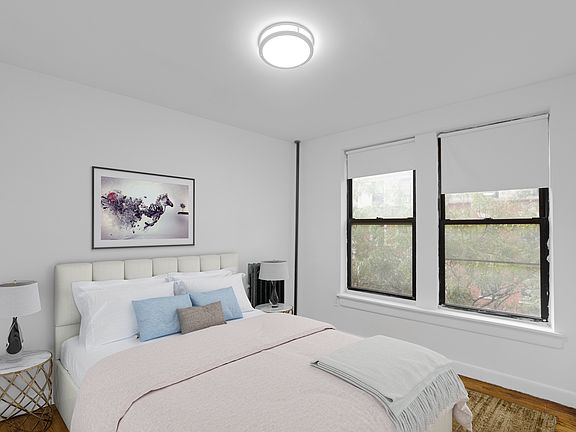 This expansive corner unit home features sprawling hardwood floors, open windowed kitchen, large windows, and overhead lighting throughout. The windowed kitchen features ample cabinetry with additional overhead shelving, and space for a small dining table. The open layout makes entertaining from kitchen to living room easy, and all bedroom are spacious + include their own generous closets.