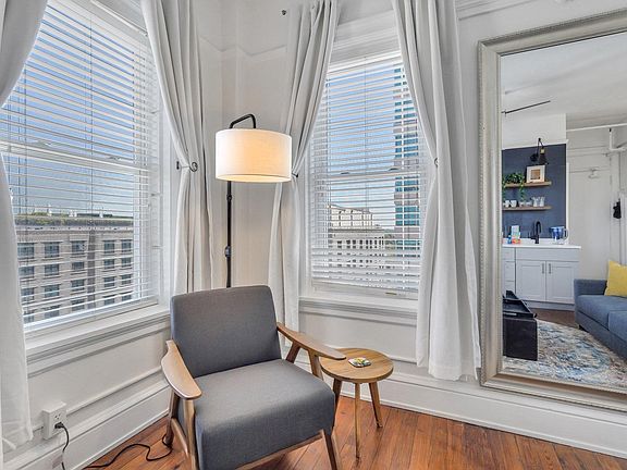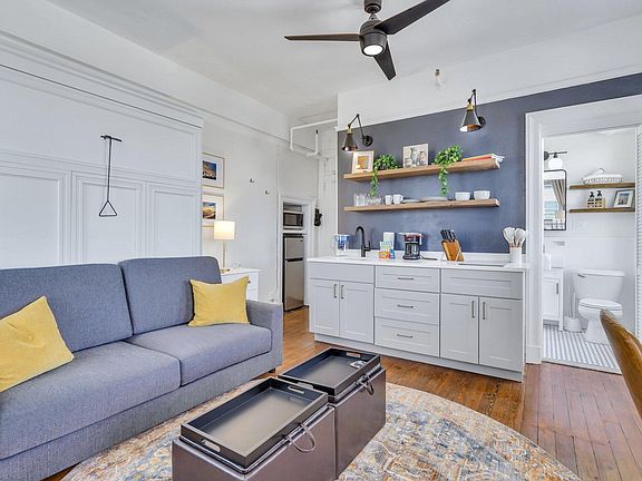 Up on the sixth floor of this almost 110-year-old building, this recently completely renovated studio apartment space features a brand new fully functioning kitchenette, updated bathroom with rainfall shower, and a living space that can transition from a cozy and relaxing area for gatherings with friends or working remotely, to a comfortable bedroom oasis with an easy-to-use Queen-size murphy bed with