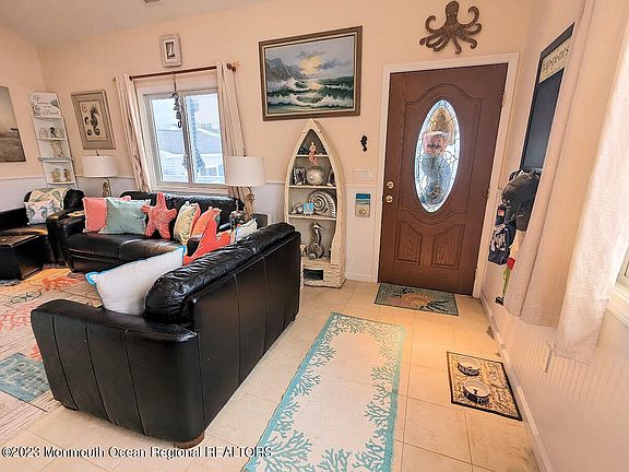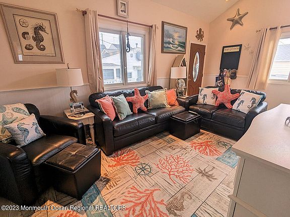 A rare offering in Ocean Beach III: only five houses to the beach on OWNED LAND! This home was built in 2014 and has high ceilings, ceramic tile floors throughout, central air and heat, washer/dryer, large kitchen counter that is perfect family meals and games, and a over-sized composite deck with plenty of room for entertaining. The electric fireplace adds ambiance and has extra storage. Parking for up to 4 cars in the driveway. Sold furnished minus a few small pieces.
