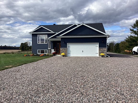 Just minutes to Arnprior, located in Ferguson Beach on the Ottawa River, this exceptionally crafted high bungalow comes with a large workshop only seen in your dreams! It sits on a private, spacious 1.25 acre lot. The home offers approximately 1450 sqft above grade plus a finished basement adding another 1,000+, showcases outstanding attention to detail throughout. The main level features 9 foot ceilings, wide plank luxury vinyl flooring, quartz countertops across the entire level, pot lights, and custom lighting, creating a polished and modern feel. The layout includes four bedrooms and three bathrooms, with one bedroom currently used as a home office or workspace. Both upstairs bathrooms feature his and hers sinks, beautiful vanities and immaculate tile work. Two upstairs back-to-back electric fireplaces add warm and cozy vibes, while the propane fireplace and bar downstairs gives an additional entertainment lounge for the kids and family events. Due to the raised structural approach, the basement is bright with plenty of natural light and offers excellent additional living space for family to spread out in absolute comfort. Outside, enjoy a new deck with a custom pergola, perfect for relaxing or entertaining in the warmer months. The home is equipped with all the bell and whistle systems: water softener and filtration system, new washer and dryer, modern appliances, HRV and GenerLink. What makes this property extra special is the attached heated double garage which is spray foamed and finished with steel cladding. And here's the best for last: The $150,000 detached heated shop which offers 780 sqft of workspace plus a 300 sqft lean to for summer parties and relaxing, complete with running water, floor drains, wiring for welding, massive tube heater and 3 insulated bay doors! A 12 x 16 hickory shed with electricity provides even more storage, making this property ideal for those seeking space, functionality, and quality craftsmanship in a peaceful rural setting.