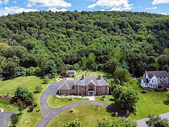This stunning brick Colonial sits atop Hunting Ridge Drive on a sprawling two-acre level lot, offering panoramic views of the Farmington Valley and breathtaking sunsets! The back of the property features spectacular mountain views and direct access to a hiking trail. As you step into the two-story marble foyer, you'll be captivated by the craftsmanship and meticulous attention to detail throughout the home. The spacious chef's kitchen, spanning approximately 1,000 square feet, is a true showpiece. It boasts abundant cabinetry, ample lighting, a fireplace, a large island, and an informal dining area. The kitchen is fully equipped with two wall microwaves, two wall ovens, two dishwashers, three sinks, and two additional mini-fridges. Adjacent is a formal dining room featuring a tray ceiling and three large windows that frame the breathtaking views. The first-floor primary suite includes a Brazilian cherry wood office/library, while the second-floor primary suite includes its own private study or office space. Additional highlights of this exquisite home include seven fireplaces, 10-foot ceilings on the first floor, a circular driveway, a large Trex deck, a flat backyard, and a finished lower-level recreation room. Simsbury was recently ranked as one of the "Best Small Towns in Which to Live" by Money Magazine, with its many cultural events, top-rated school system, and preserved open spaces.