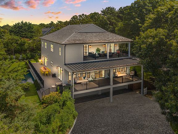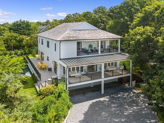The long driveway takes you through the 1.6 acres of park like grounds, that lead to this enchanting home nicknamed "The Treehouse". Surrounded by nature, this completely renovated, three level home offers everything you will need in a Hamptons getaway. Enter the main level through the steel and glass double doors that open to a soaring double height foyer with custom woodwork throughout the walls and ceiling. The main level was deigned for entertainment so each room effortlessly flows both indoors and outdoors, offering plenty of space to gather. The living room is anchored by a commanding, custom made, gas fireplace which creates a cozy atmosphere in a space that offers plenty of room to spread out and relax. The completely open, custom kitchen comes equipped with all high-end appliances including a 48 inch built-in fridge, two dishwashers, a wine fridge, built-in microwave, two wall ovens, a plumbed Miele coffee maker, and a six burner gas cooktop. This is finished with an over 9 foot quartz waterfall island with cabinet storage on both sides. A separate formal dining, with wet bar, is directly off the kitchen for those special occasions. Finishing the main level is a guest suite, with custom closets, an en-suite bathroom, and a private courtyard. On the second level, you'll find the primary suite, which is the entire left wing of the home. It includes another custom built gas fireplace, two custom closets, an en-suite bathroom featuring a soaking tub, double vanity, and a double walk-in shower. This suite also includes a private deck that overlooks the treetops, with views of Peconic Bay that are perfect for the most beautiful sunsets. The right wing includes two guest bedrooms, a full bathroom with walk-in shower and soaking tub, and a laundry room with two washers and dryers. Down the staircase to the lower level you'll enter the full bar which features another quartz island, bar fridge, wine fridge, and ice maker. Off the bar, you can enter the 4 car garage that also includes a giant storage room. Off the other side of the bar, you'll find the media room and the gym, which includes another full bathroom. The best part of the house waits for you outside where you'll find the gunite salt water pool with built-in spa. Decks wrap around two sides of the house and overlook the grounds, are perfect for outdoor dining or for lounging around in the morning. All of this is surrounded by Cold Spring Pond where you can enjoy swimming, water sports, and shellfishing, steps from your front door. Located just minutes from Southampton Village, restaurants, and award winning beaches.