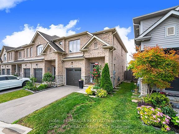 Presenting 24 KINGSBOROUGH DR. An Exceptional End Unit Freehold Townhouse with 1522 Sq Ft in a Sought after Stoney Creek Mountain. House offers an amazing Location, Steps to All Major Retail Shopping and Minute to Red Hill Expressway. House is absolutely Loaded with Upgrades including an Open Concept Main Floor Plan, 9ft Smooth Ceiling, Freshly Painted (Jun 2025) . Modern Kitchen with High end Ceramic, Extended Kitchen Cabinets, Elegant Backsplash, Granite C/T, Breakfast Centre Island, Under Mount Kitchen Sink and Stainless Steel Appliances. Open Concept Living Room with New Hardwood Floor (2025) and Pot Lights. Dining with Walk Out Patio Doors Over Looking to a Tastefully Landscaped Concrete Private Backyard for Summer enjoyment. Leading to Second Level Boasts Hallway Hardwood Floor, Master Bedroom with W/I Closet and 4Pc Modern Ensuite with Standing Shower. Bright Spacious and Sun Filled 2nd and 3rd Bedrooms. Visitor Bath with High end Ceramics. Conveniently Located 2nd Level Laundry with Double Door and Uppers. Very small Road and Snow Removal POTL Fee, Private Driveway and No Side walk. This House Exemplifies Top Quality Finishing. Book your showing with Full Confidence.