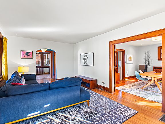 This home boasts great curb appeal starting with the large porch. Enter into the main living area where original woodwork, transom windows, french doors and lots of natural light grace the space. The beautiful solarium has tile floors and would make a great office! Kitchen has breakfast nook with built-ins and lots of light! Primary bedroom has access to loft space! 2-car garage, currently used as a finished space.