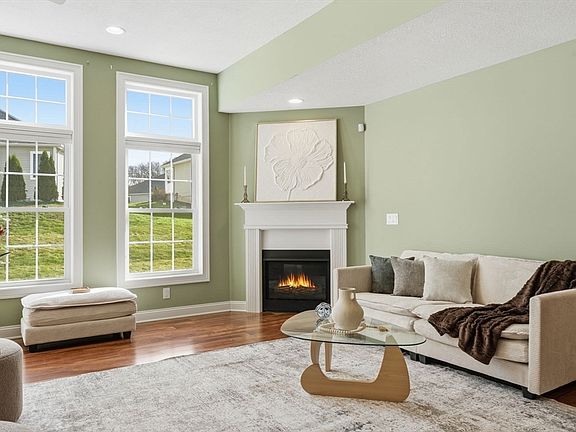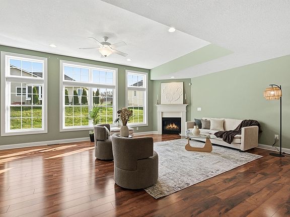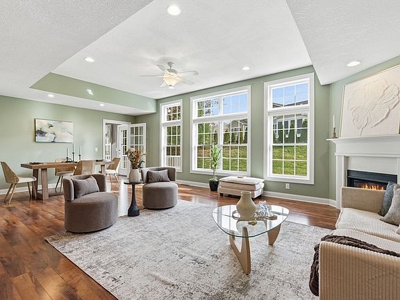 Corner fireplaceTrex deckTray ceilingDedicated dining roomBright comfortable livingSeasonal viewsCherry cabinets