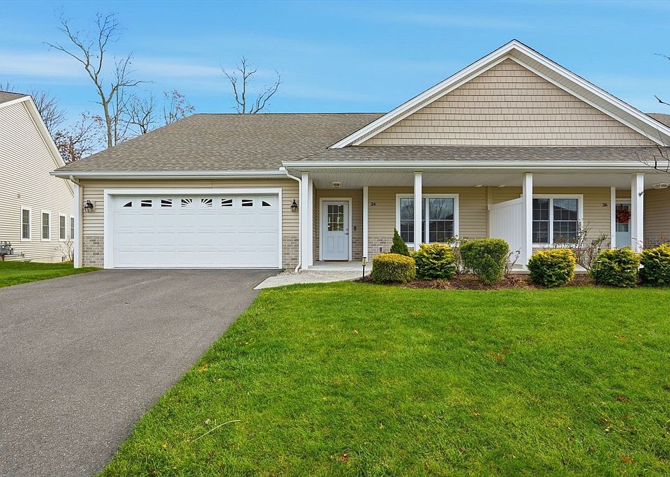 Introducing a beautifully maintained GRANDVIEW side by side condo built in 2020 offering bright, comfortable living in one of the area’s most sought-after 55+ communities, The Gardens of Wilbraham. The living room features a tray ceiling, a corner fireplace, & stunning floor-to-ceiling windows that fill the space with natural light. A dedicated dining room sits just off the kitchen, which includes cherry cabinets, an 8-foot breakfast bar, & plenty of space for everyday use .The primary suite offers convenience & privacy w/ its own full bath & a walk in closet. A guest bedroom with wall-to-wall carpeting & an additional full bath w/ a linen closet provide ideal accommodations for visitors.The sunroom is a versatile retreat, perfect for an office, reading nook, or simply a quiet space to unwind. Step outside to the TREX deck & enjoy seasonal views. A full basement offers storage and future possibilities. Additional highlights include a generator and access to the impressive clubhouse.