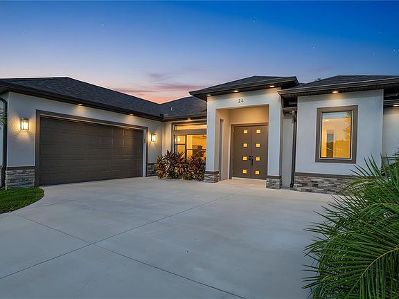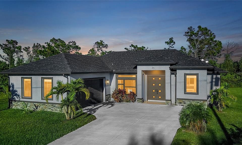 Welcome to this stunning one-year-old home featuring a lovely pool, situated on a peaceful street near the golf course and just a short drive from the best beaches! As you enter, you'll notice the spacious open floor plan with 10-foot ceilings that create an airy feel, complemented by stylish tray ceilings in the living room, master bedroom, and dining area. The kitchen is perfect for cooking and entertaining, offering plenty of cabinets and a large 9-foot island for additional counter space. Enjoy sleek quartz waterfall countertops and low-maintenance ceramic flooring throughout the home. The master bath is a true oasis, featuring double sinks, a stand-alone bathtub, and a glass-enclosed shower. The pool area is fully screened for comfort, and plumbing and electrical connections are already in place for a future outdoor kitchen! This home also boasts 8-foot doors and durable impact doors and windows for added peace of mind and located in a flood-free zone, making it a fantastic place to live and enjoy!
